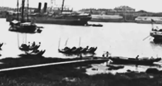 黄浦江岸边的简易济渡码头,江滩上排列着五六艘小舢板。来源:上海城建档案