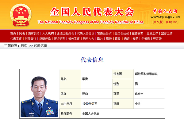 全国人民代表大会网站 截图官方权威渠道近日披露,曾任中部战区副参谋长的空军少将李勇已晋升副战区级。十三届全国人大一次会议开幕前夕,中国人大网公布的来自解放军和武警部队代表团的十三届全国人大代表李勇的代表信息显示,其已佩戴副战区级资历章。官方公开信息显示,李勇出生于1960年7月,北京市人,曾担任过原兰州军区空军参谋长、副司令员等职务,并于2016年调任中部战区副参谋长,空军少将军衔。