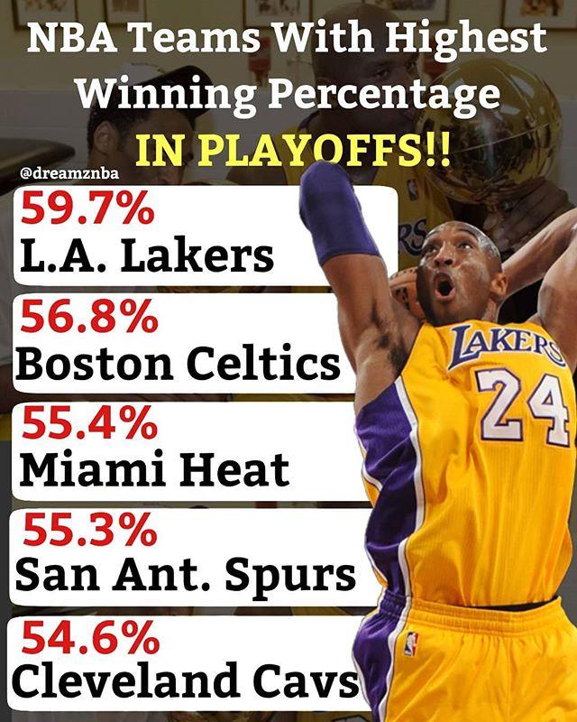 NBA季后赛历史胜率排名前五的球队:洛杉矶湖人59.7%,凯尔特人56.8%,热火55.4%,马刺55.3%,骑士54.6%。