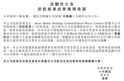 同时,公告称,雷军在上市前获得的不超过639,596,190 B类股(激励股份)捐赠予慈善机构。这是2018年4月2日董事会认可雷军对公司贡献而授予的,占当时公司总股本的2%。