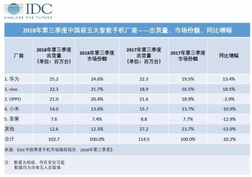 据IDC此前发布的报告,2018年第三季度,全球智能手机总出货量为3.552亿台,较去年同期下降了6.0%,这也是全球智能手机出货量连续第六个季度同比下滑。