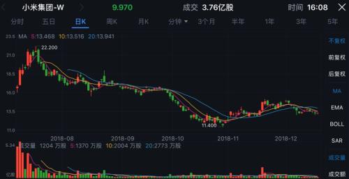 1月10日,小米开盘后股价一度跌超8%,截至收盘下跌3.58%,以9.97港元/股收盘,创下上市以来新低。