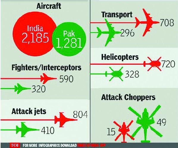根据《印度时报》网站的信息图,印度拥有590架战斗机(截击机),巴基斯坦拥有320架战斗机;在攻击机方面,印度804架,而巴基斯坦拥有410架;在运输机方面,双方的对比为708架对296架;直升机的实力对比则是720架对328架,攻击直升机则是15对49。