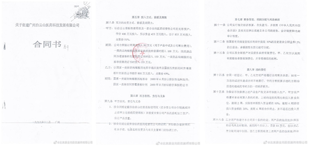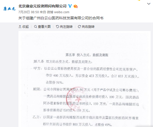 2019年7月20日,康业元公司微博[股评]发布了3张图,配文是“关于组建广州白云山医药科技发展有限公司的合同书”——
