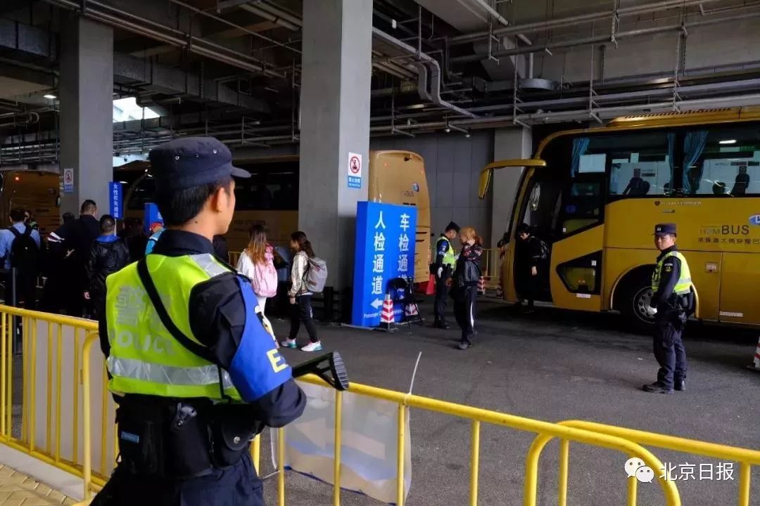 ▲民警协助、指引乘客下车遇到孕妇、使用心脏起搏器等特殊情况的乘客,警方开通了特殊通道。他们不必再经过安检门,由民警进行全程人工安检。同时,民警也会在乘客不便时,帮助乘客拿取行李。