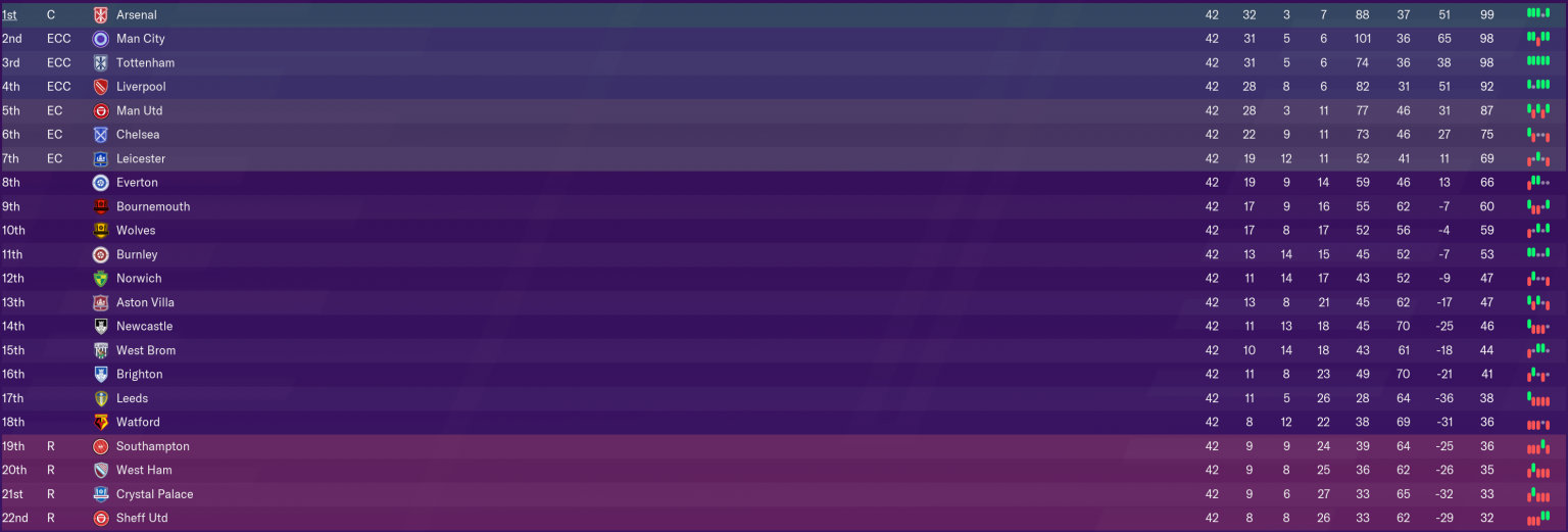 随后,统计网站Squawka用足球经理游戏模拟了22队英超参赛的结果,结果阿森纳99分夺取冠军,曼城和热刺都拿到了98分,利物浦和曼城则分别排名第四和第五……