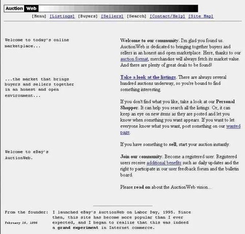 我听说皮埃尔是 Usenet(世界性新闻组网络)的常客,在那里泡了数千个小时。我相信这些新闻组的帖子对他的成功至关重要。1995 年的国际劳动节,他创办了 AuctionWeb,并开始在 Usenet 上发布相关信息。AuctionWeb 在推出时是免费的,而且是个人对个人的拍卖网站。在皮埃尔的埃博拉病毒网站上有一个链接。