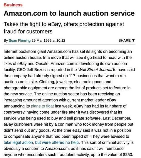 Amazon 以不关注竞争对手而闻名,但据《一网打尽:贝佐斯与亚马逊时代》(The Everything Store: Jeff Bezos and the Age of Amazon )一书称,他们担心 eBay。“……eBay 拦截了 Bezos 无限选择的梦想,并抢走了万货商店的衣钵。”