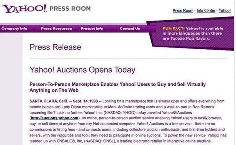但在 eBay 的路演中,Yahoo! 宣布与 Onsale 合作,在 Yahoo! 主页上提供免费的私人间拍卖服务。哦,我的天啊!当时投资者们对 eBay 持怀疑态度,Yahoo! 或许是互联网最受推崇的公司,而且与 eBay 不同的是,他们不收取任何费用。