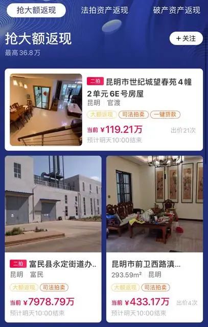 在“大额返现”页面,记者看到:昆明市世纪城望春苑4幢2单元6E号房屋、昆明市前卫西路滇池湖岸花园(一期)2-6地块39幢1单元-1-2层101室房屋、昆明市白龙新区高2幢1单元1102号等法拍房均在板块内。