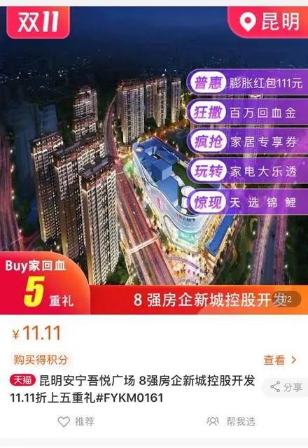 而在新房百亿补贴板块,多个城市的在售楼盘可以花费11.11元购买99折电子兑换券。