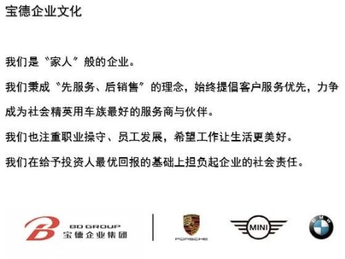 宝德企业集团成立于1993年,经营汽车销售服务产业,专注于江浙沪地区,高端汽车品牌代理。宝德企业集团秉承“先服务、后销售”的理念,始终优先提供客户服务。