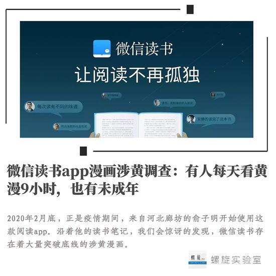 事实上,微信读书app上的这些低俗内容此前就被用户公开投诉过。早在2019年11月,就有家长在微博上公开质疑微信读书,表示很多年轻人都在使用这款app,但平台却不断地推荐“擦边球漫画”,以及明星八卦和标题党。除了漫画作品,平台也会根据陌生人社交的推荐机制,展现“附近的人”阅读内容,这些内容往往格调低下,存在猎奇和涉黄倾向。