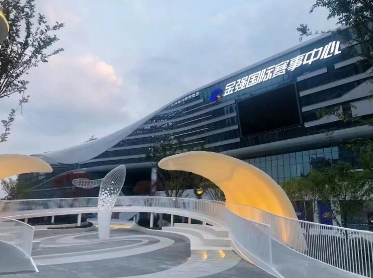 金强国际赛事中心由四川金强集团投资兴建,占地125亩,总投资约18亿元。中心外部机理烙印温江鱼凫文明,在充分结合城市文明的同时融入篮球元素,成为复合多元体验的城市体育综合体。