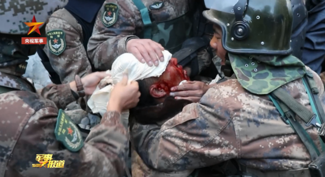 祁发宝被战友们救到一边,意识已经模糊。包扎伤口时,他突然一把扯掉头上的绷带,还想往前冲,但这一扯用尽了他昏迷前最后一丝力气,随即重重倒地。