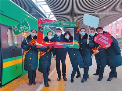 当天早上,“绿巨人”吸引了很多旅客的目光,大家纷纷拿出手机,饶有兴致地和这条绿色长龙亲切合影。担当乘务工作的沈阳客运段动车三队乘务员身披绶带,笑迎八方来客,组织安全乘车。8点整,随着一声汽笛,D824次列车缓缓使出车站,为冬日的辽沈大地增添一抹新绿,旅客们怀着欣喜和好奇踏上了这趟尝“先”之旅。