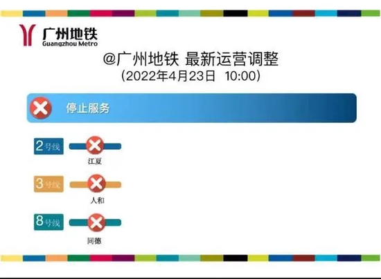 4月23日,广州白云发布通知,4月23日10时起,白云区6个地铁站点、1个地铁口、182个公交站点恢复运营。