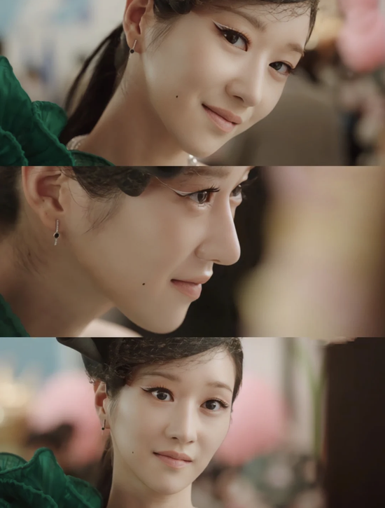 后面女主妆容眼妆部分也多次画了“截断”眼妆。在颜色选择上,更加出彩和大胆。