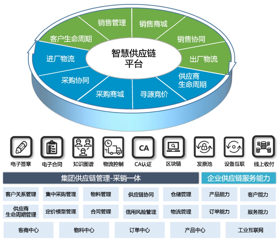 (2)智慧供应链平台,为集团型企业的供应链管理和数字化转型提供服务,从供应商到客户、从采购环节到销售环节,打通“端”到“端”对外互动的各类集团型企业的业务场景,帮助其统一标准和开拓个性化业务;从企业业务到行业生态,融合客商关系,帮助企业开拓新市场和新业务,展现企业数据汇聚优势,发挥供应链数据资产金融价值。该平台将促进基于大数据分析决策的智慧化信息管理模式的发展,打造企业级“智慧大脑”,前瞻性地指导、优化传统供应链的运营管理和业务运作模式,打造精益、绿色的供应链业务链条,改善供需分析并实现降本增效,提升企业的经营管理水平,提高社会资源的利用率。