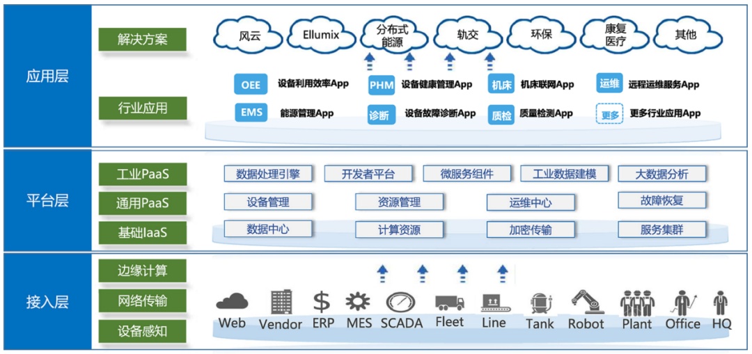 星云智汇工业互联网平台通过iot服务能力、paas服务能力、开发运营能力、可视化开发能力、数据服务能力、安全保障能力等核心能力,构建良好的工业app开发环境,使开发者基于平台数据和微服务功能实现应用创新,为用户提供生产过程管理和增值服务等一系列创新性业务应用。该平台主要分为接入层、平台层、应用层3层架构体系。