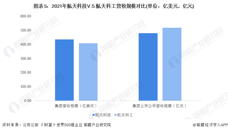 根据2022年《财富》世界500强企业名单统计,2021年航天科技和航天科工集团营收规模分别为434.20亿美元和408.56亿美元,两集团旗下上市公司营收规模分别为479.54亿元和517.18亿元。在集团规模层面,航天科技略胜一筹,但在集团旗下上市企业规模层面,航天科工略领先。
