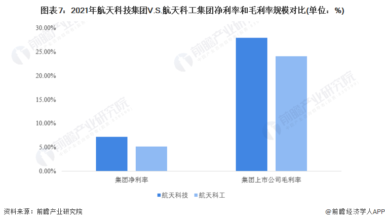 从集团净利率对比来看,2021年航天科技为7.14%,航天科工为5.16%。从企业上市公司毛利率均值对比来看,2021年航天科技均值为27.93%,航天科工均值为24.05%。总的来看,在集团盈利领域,航天科技略胜一筹。