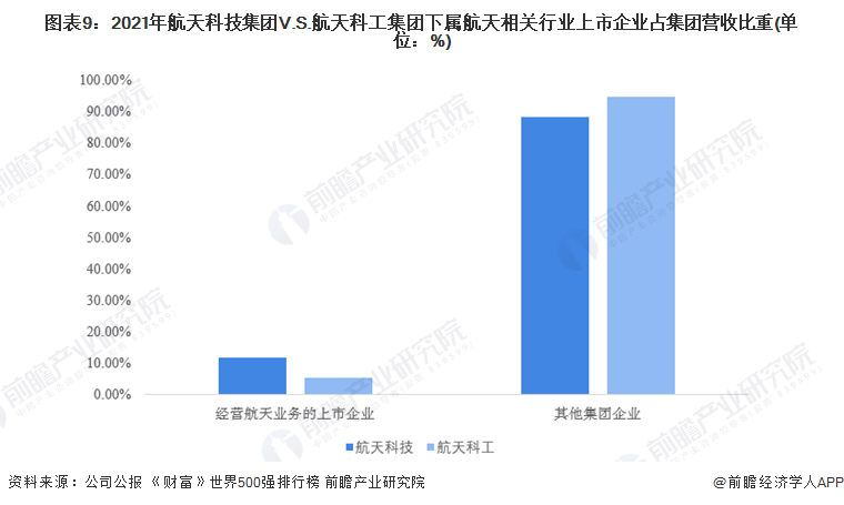 根据2022年8月公布的《财富》世界500强排行榜披露,2021年航天科技集团营收规模达到434.2亿美元,约合人民币2801.21亿元,公司航天相关行业营收占集团总营收的11.64%,占集团上市企业总营收的68.05%。2021年航天科工集团营收规模达到408.56亿美元,约合人民币2635.83亿元,公司航天相关行业营收占集团总营收的5.17%,占集团上市企业总营收的26.35%。
