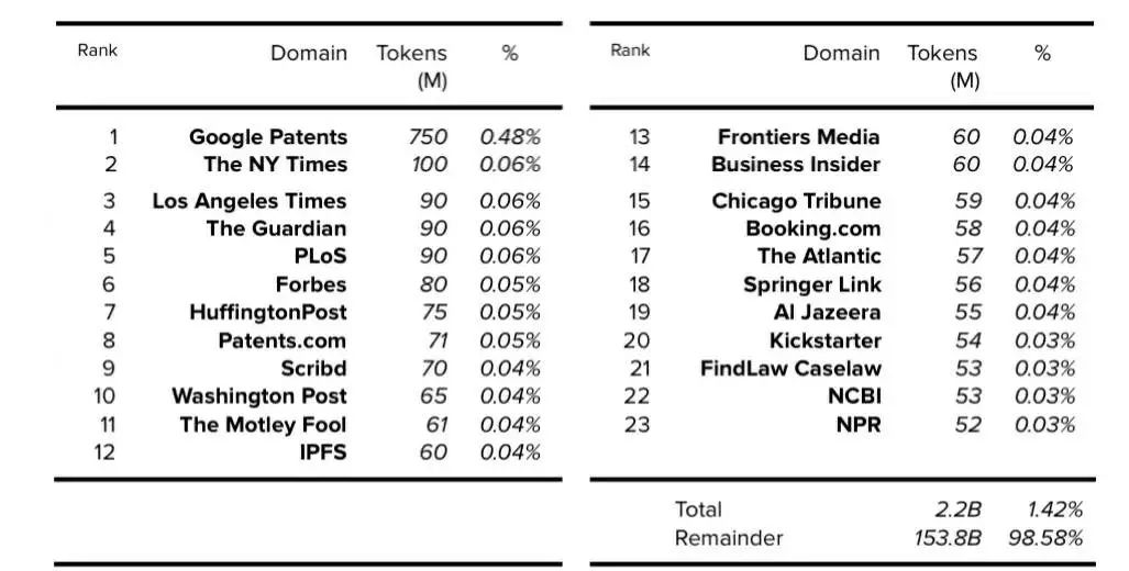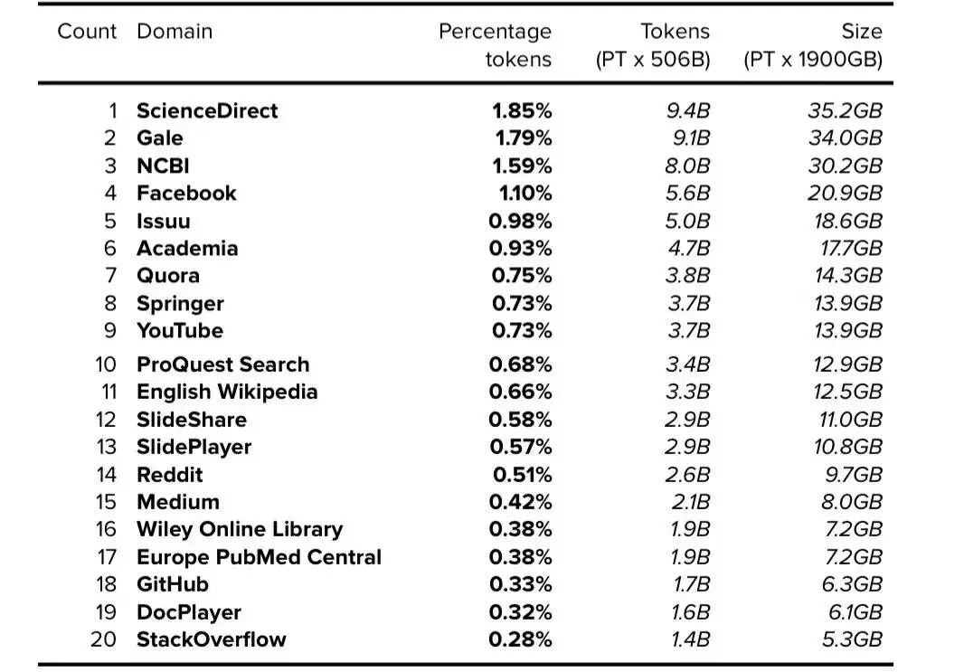 DeepMind于2014年被谷歌收购,并在创建MassiveText时获得了海量数据。虽然Gopher论文中没有进一步详细描述MassiveWeb,但第44页附录中的表A3b注明了MassiveWeb中出现的前20个域[29]。根据披露的每个域所占的百分比,我们可以使用MassiveWeb的总token数(5060亿token)和总原始大小(1900GB)来确定每个域的token数量和大小。