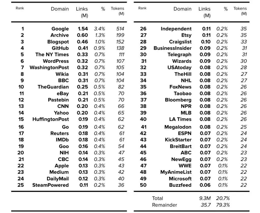 14. GPT-2 model card: https://github.com/openai/gpt-2/blob/master/model_card.md: “我们已经发布了WebText中出现的前1,000个域及其频率的列表。WebText中排名前15位的域是:Google、Archive、Blogspot、GitHub、纽约时报、Wordpress、华盛顿邮报、维基亚、BBC、卫报、eBay、Pastebin、CNN、雅虎和赫芬顿邮报。”