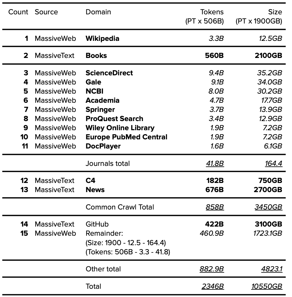 表16. 公开的Gopher数据集 (MassiveText)。公开的数据以粗体表述,确定的数据以斜体表示。
