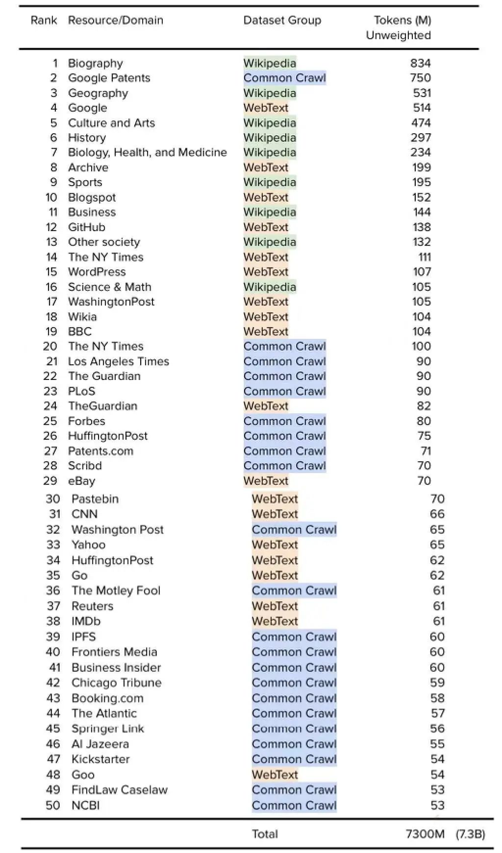 基于本文内容,尤其是每个数据集中每个资源的token数量,我们可以对将Wikipedia + Common Crawl + WebText数据集的组合,作为其整体训练数据集的一部分模型进行资源或域的排序。为清楚起见,这包括以下模型:OpenAI GPT-3、EleutherAI GPT-J、EleutherAI GPT-NeoX-20B、Meta AI Megatron-11B和RoBERTA,以及 Microsoft/NVIDIA MT-NLG等。