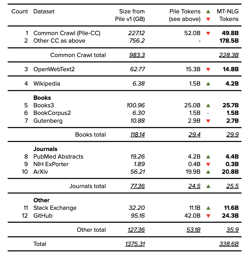 如前所述,有关数据集大小的更多详情,可以使用The Pile v1论文中提供的信息来确定。虽然使用的组件相同,但注意的是,MT-NLG和The Pile v1中报告的组件大小却各不相同,这是由于来自Eleuther AI (The Pile v1数据集)和Microsoft/NVIDIA (MT-NLG模型)的研究人员采用了不同的数据过滤和去重方法。