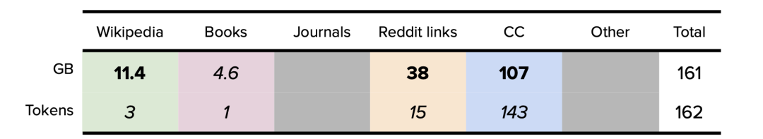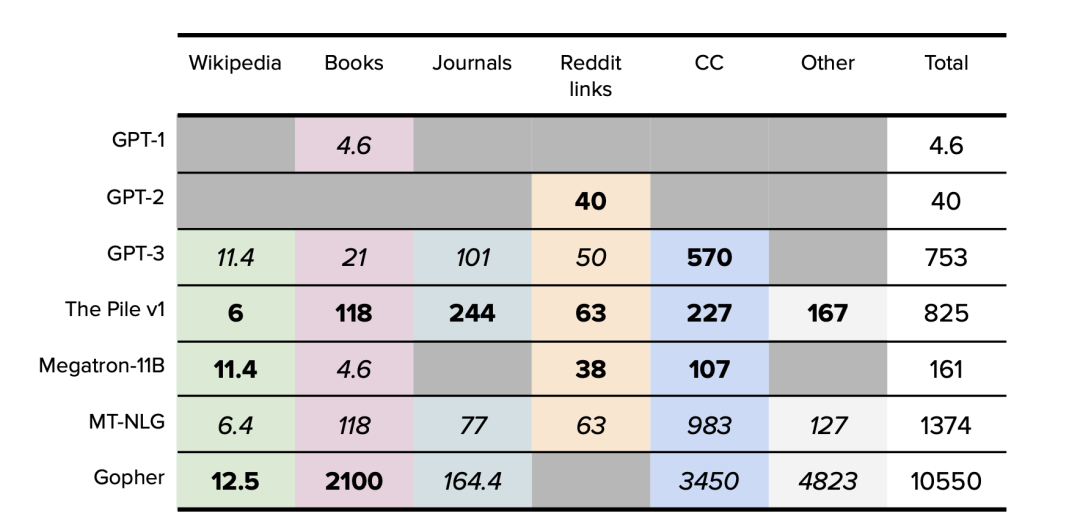 表5.GPT-1数据集总结。以GB为单位。公开的数据以粗体表示,确定的数据以斜体表示。