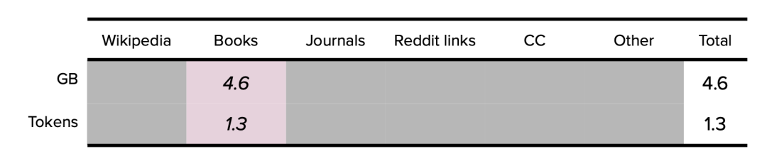 特别值得关注的是,在OpenAI的GPT-3论文中,并未公开Books1数据集(120亿token)和Books2数据集(550亿token)的大小和来源。关于这两个数据集的来源人们提出了几个假设,包括来自LibGen18和Sci-Hub的类似数据集,不过这两个数据集常以TB为计,大到无法匹配。