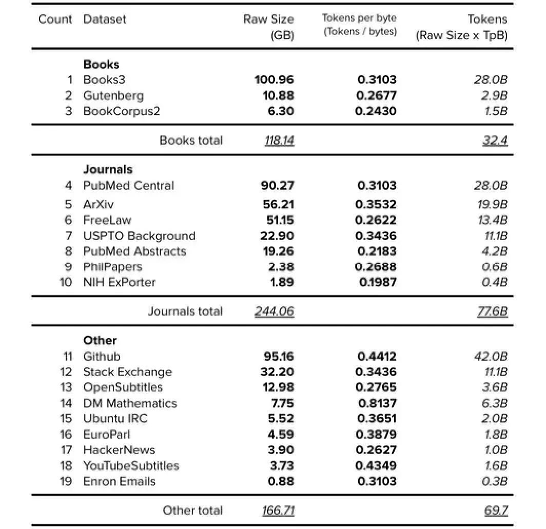 The Pile v1数据集由EleutherAI于2021年发布,该数据集已被用于训练包括GPT-J、GPT-NeoX-20B在内的多种模型,并作为包括MT-NLG在内的其他模型的部分数据集。The Pile v1论文阐明了所用训练数据集的来源和大小。随着token数量的增加,The Pile v1论文应被用作未来数据集文档的黄金标准。