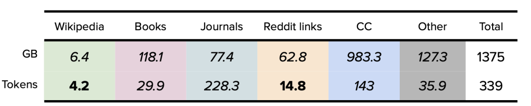 表10. The Pile v1数据集。公开的数据以粗体表示,确定的数据以斜体表示。