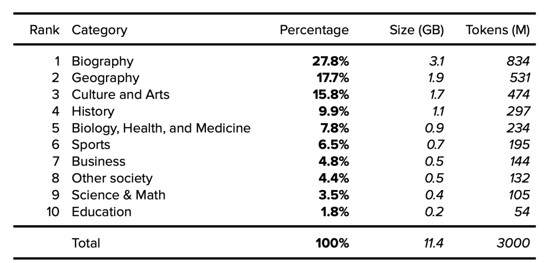 下面按类别[9]列出了维基百科的详细信息,涵盖了2015年抽样的1001篇随机文章,研究人员注意到随时间推移文章传播的稳定性。假设一个11.4GB、经过清理和过滤的维基百科英文版有30亿token,我们就可以确定类别大小和token。