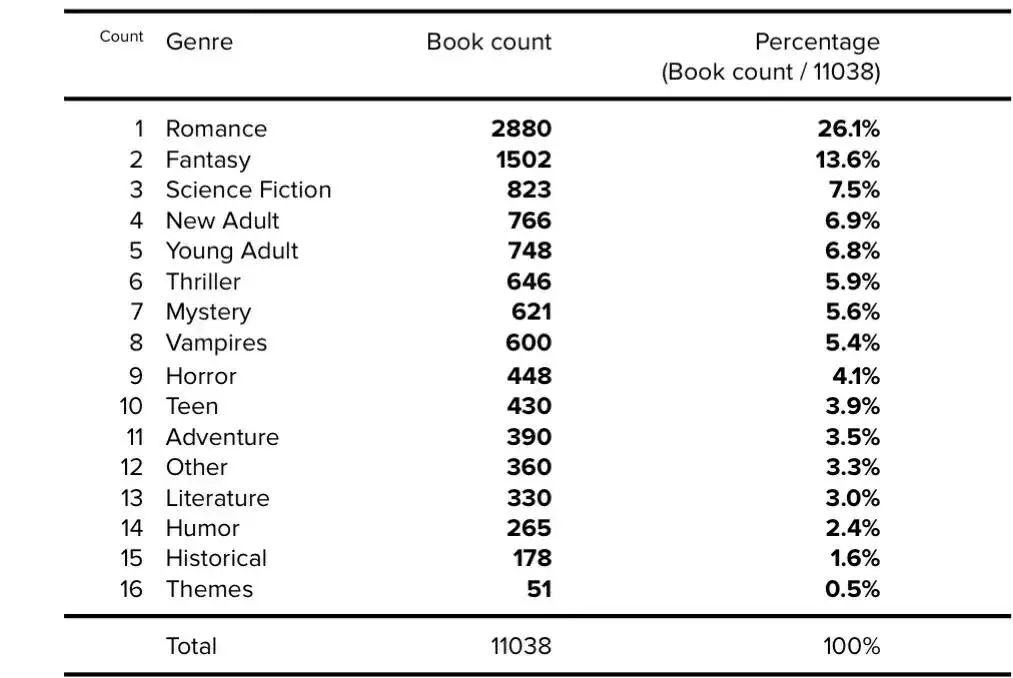 2021年,经过全面的回顾性分析,BookCorpus数据集对按流派分组的书籍数量和各类书籍百分比进行了更正[12]。数据集中有关书籍类型的更多详细信息如下: