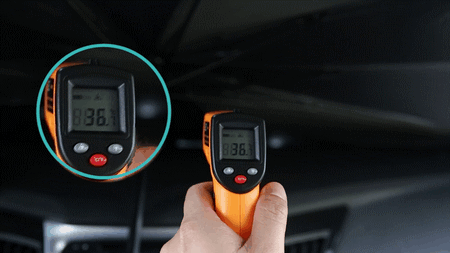 经过30分钟暴晒,我们用测温枪测一下,车内温度已经高达54.2℃,非常闷热...