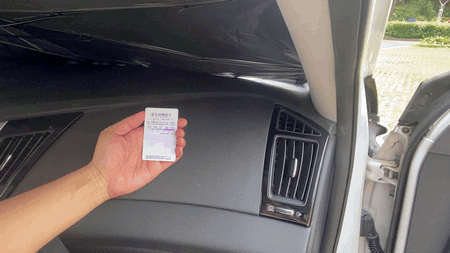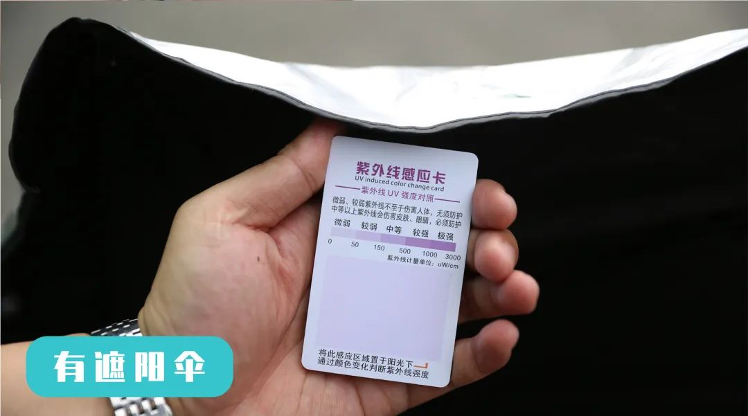而在遮阳伞的防护下,测试卡呈白色状态,紫外线达到微弱近乎为0的状态,再也不用担心车内皮革提前老化了。
