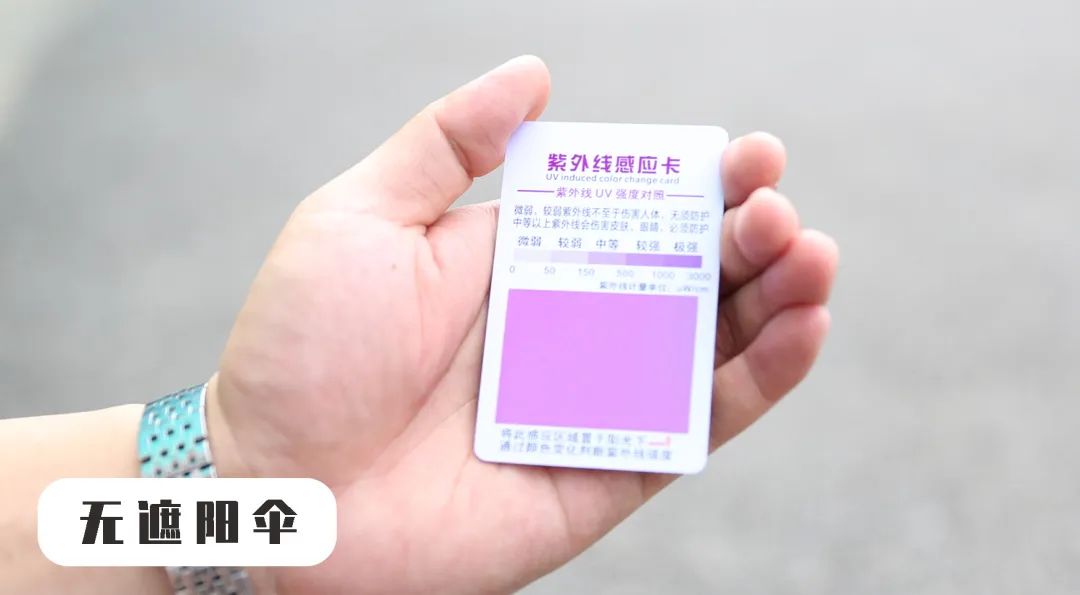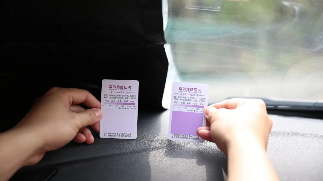 通过色差我们可以看出,裸露在阳光下的测试卡已经呈现深紫色,紫外线极强。