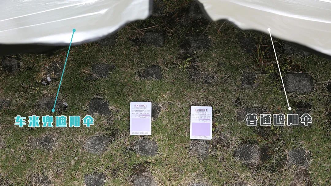 小编将两张紫外线测试卡分别放在无遮阳伞以及有遮阳伞的区域: