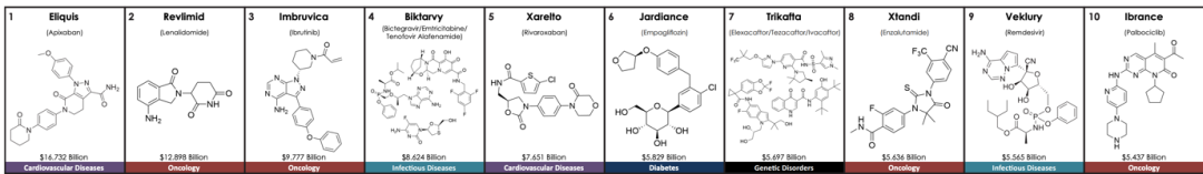 根据最新发布的2022版榜单,笔者整理了销售额最高的十种小分子药物名单如下: