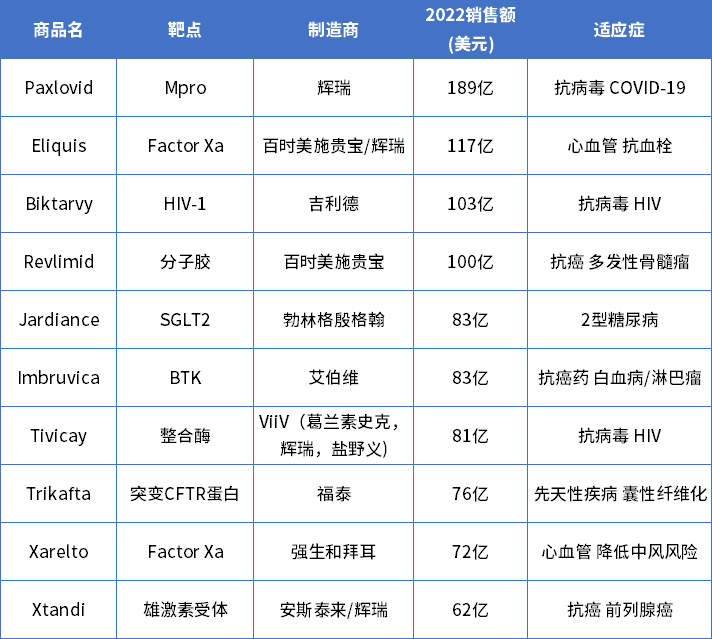 上表显示了2022年销售额排名前十的小分子药物,主要显示以下亮点: