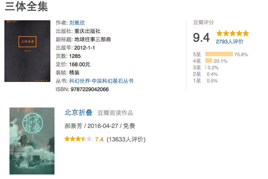 两部雨果奖获奖作品在豆瓣上的评分