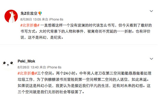 对于《北京折叠》在美国大受欢迎的原因,托马斯夫妇表达了自己的读后感:“我们喜欢《北京折叠》平衡了科学与社会学的观点,这个故事的焦点仍停留在一个男人对家庭的爱。我们认为这个故事无懈可击。”