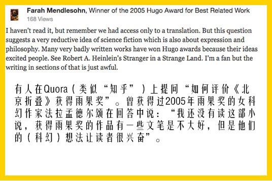 在被问到如何看待中国网友的差评时,协会委员会成员谢丽尔·摩根说,“很明显这个故事很受西方读者的欢迎”,“不过在西方,是会有一些人不是那么喜欢女性作家写的科幻小说”。