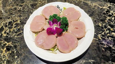 湄公河巴沙鱼:亦是招牌菜品之一。选用湄公河进口优质巴沙鱼,无刺无腥,整条洗净,切成薄片,装盘冰镇。