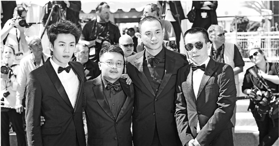 导演毕赣,主演黄觉、李鸿其、陈永忠组成“地球最后的男人帮”亮相戛纳红毯,联合出品人黄晓明也一起现身。