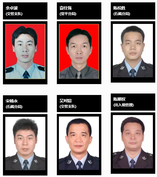余卓波(1976.3-2005.12),男,东莞市东城人,中共党员,2001年6月参加公安工作,生前系东莞市公安局交警支队东莞高速公路大队交管股民警。2005年12月13日,莞深高速公路北行路段发生一起交通事故,余卓波与同事迅速赶到现场处理。其时,余卓波接到亲戚来电,告诉他医院正等他签名,准备为他父亲做血液透析。他回答:“我正在处理事故,一个民警不能处理,我做完事马上去医院。”挂了电话后他继续伫立在寒风中处理交通事故。此时,一辆疲劳、超速驾驶的载客大巴突然冲进事故现场,余卓波被撞致重伤,经抢救无效殉职。2006年3月16日,省公安厅决定给余卓波追记个人一等功1次;同年10月1日,省人民政府批准余卓波为革命烈士。————